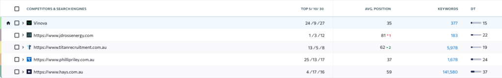Vinova holds more Top 5 and Top 30 rankings than all competitors in its core segment. While larger job platforms appear for many terms, Vinova’s hyper-relevant content strategy allows it to outperform more generic listings in visibility and intent.